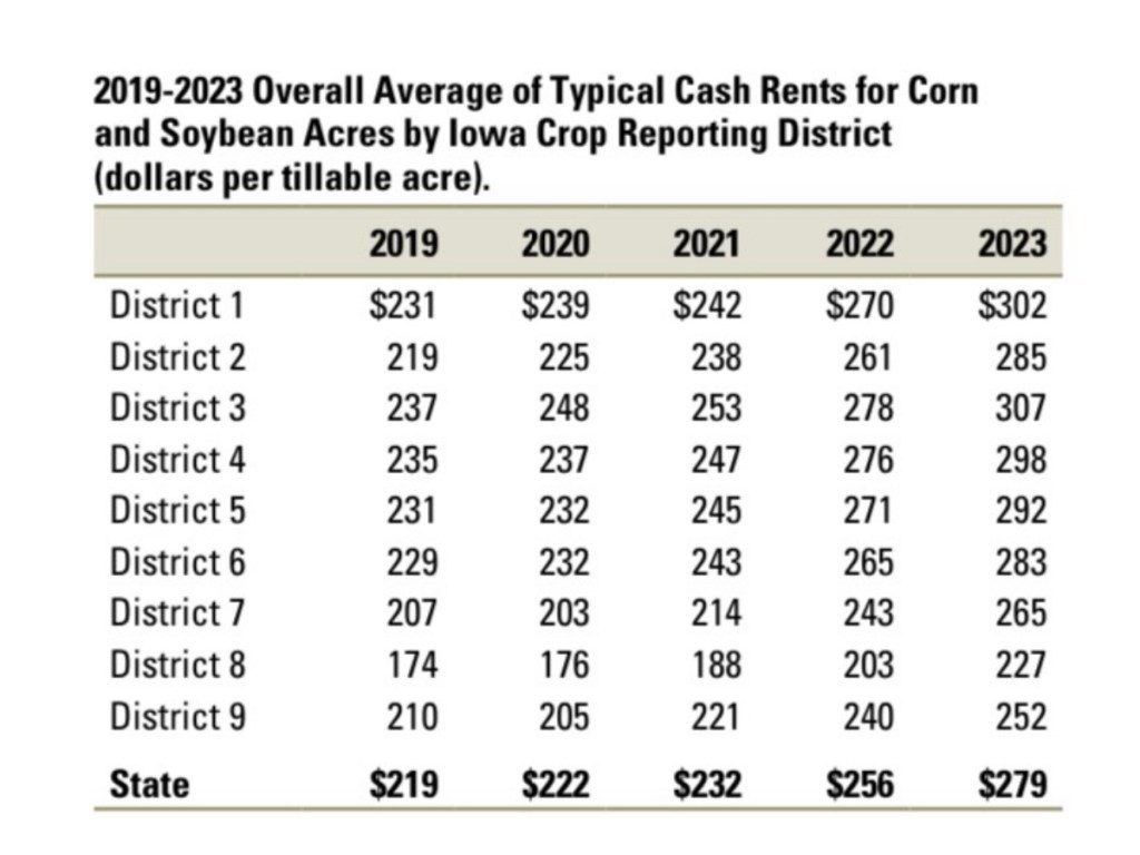 District 6 in Eastern Iowa where I live and work is made up of ten counties. Benton, Iowa, Johnson, Linn, Jones, Cedar, Muscatine, Jackson, Clinton, and Scott come in with a 2023 average cash rental rate for corn and soybean tillable ground at $283/acre. That is up from $265/acre in 2022 and $243/acre in 2021. That’s a $40/acre increase in the last two years alone.