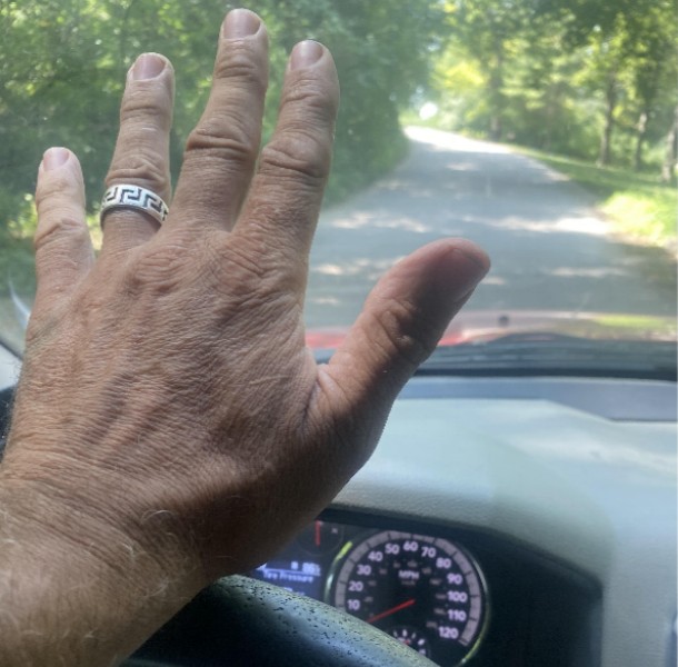 The Farmer Wave is a tradition passed down for generations. I watched my grandpa do it. He was highly skilled in The Farmer Wave as he actually was a farmer. He employed the one finger technique, which I’ll get to in a minute. He was stoic and motionless as he passed a neighbor or stranger, simply lifting his one left finger. He remained frozen like a man at an auction waiting till just the right moment to flick his one finger up and buy a pen of hogs! I always smiled as the other car greeted us back with their own variation of The Farmer Wave.